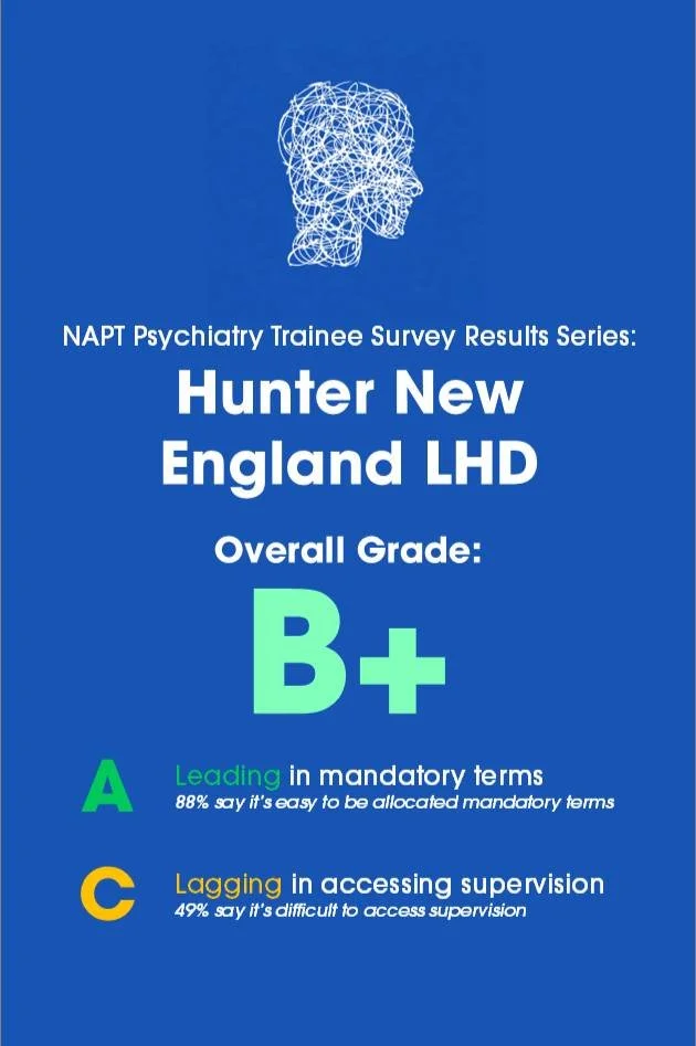 This is the second release of the NAPT Psychiatry Trainee results! HNE LHD performed well in providing mandatory terms to its psychiatry registrars, but half the respondents noted that it was difficult to access weekly, 1:1 supervision. Keep an eye out for tomorrow, for another set of district results!